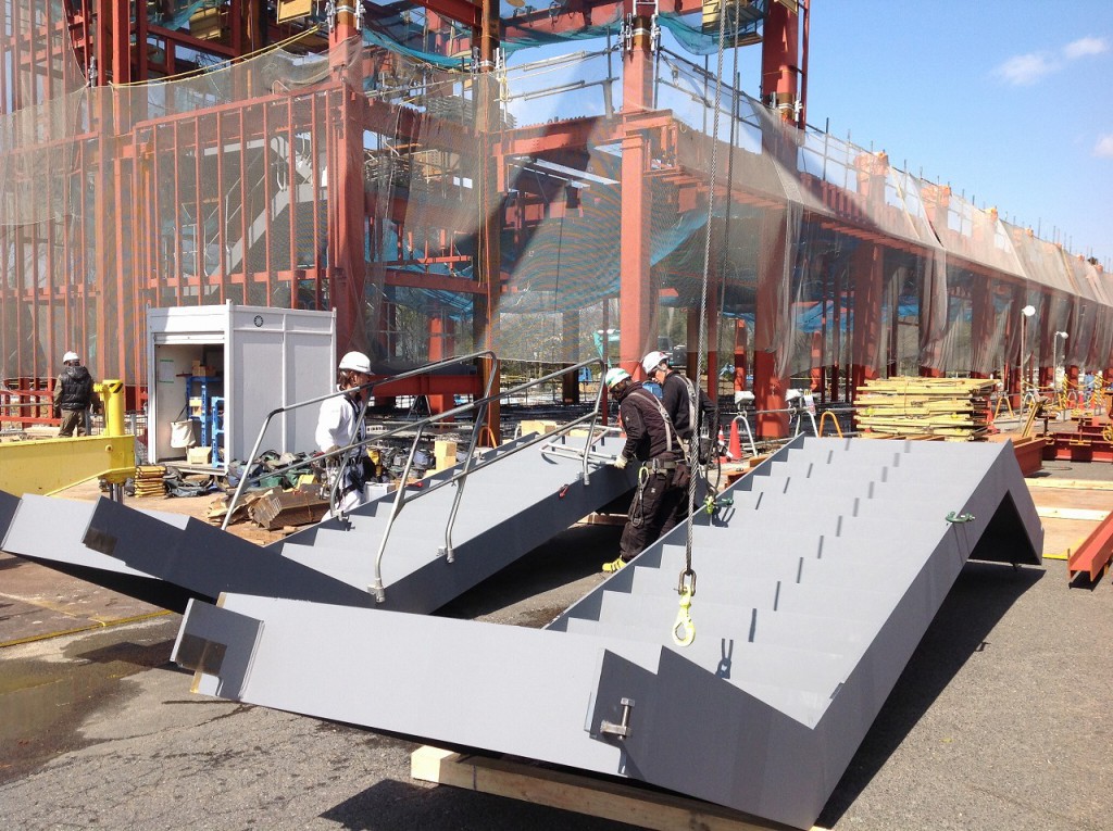 クレーンと階段をつなぐのは人の手作業。落下の危険がないよう、入念にかつ素早く鉄骨とクレーンを繋げます。